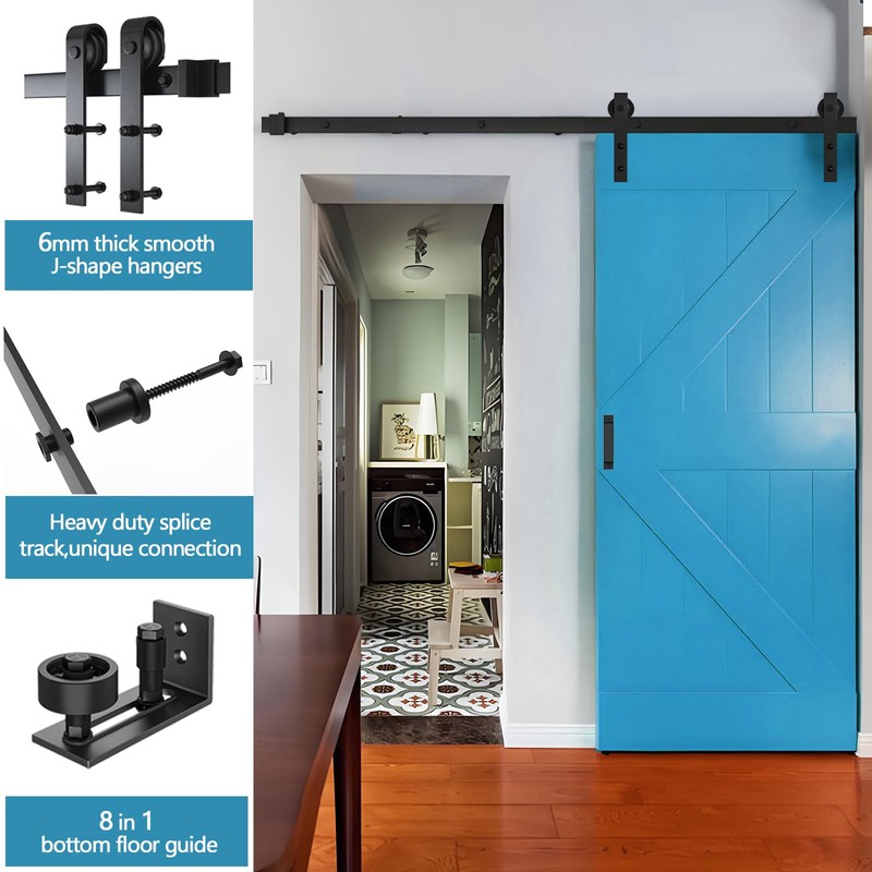 - Inclusive Package:The sliding barn door hardware kit included 5x sliding door track, 6x rail spacers, 1x 8in1 floor guide for bottom, 2x handles, 1x convenient lock 2x Rolling rollers, 2x door stopper, 2x end caps, 1 T-shaped guide, and 1 hex key—all necessary accessories assembly hardware for you to diy stylish bedroom, bathroom cloakroom, laundry room, gate,hallway. (*door not included)
