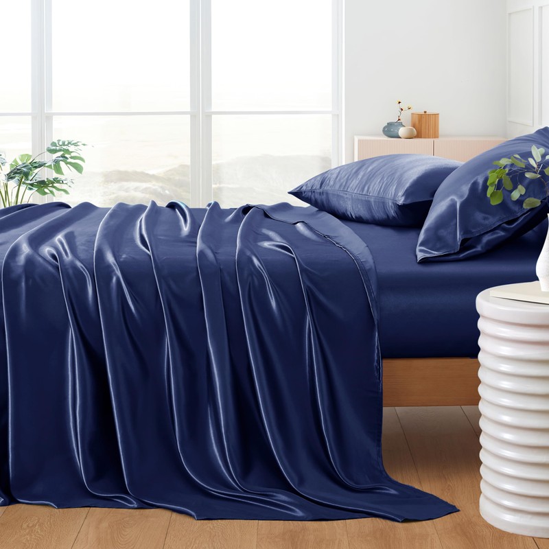 HommxJF 5Pcs Navy Blue Silk Sheets Queen Satin Sheets Set Queen Size Sheets Silky Comforter Bedding Sheets with 1 Satin Flat Sheet,1Deep Pocket Fitted Sheet,3 Satin Pillowcases with Envelope Closure