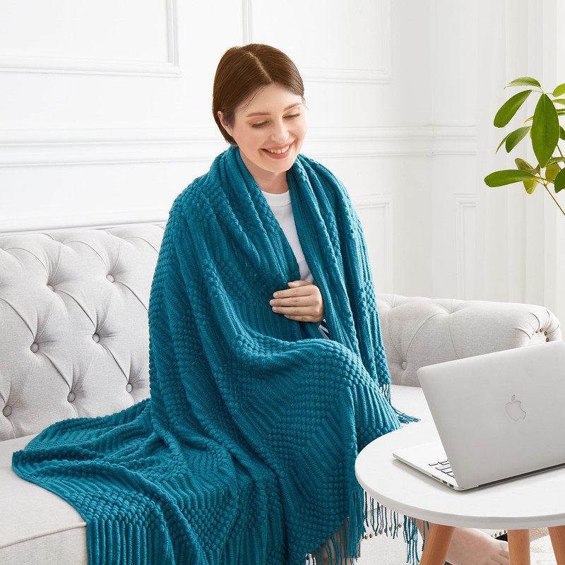 HommxJF Teal Knitted Decorative Throw Blankets for Couch, Bedroom and Officeroom,Textured Fade Resistant Soft and Warm Knit Blanket with Tassel,50"x60"