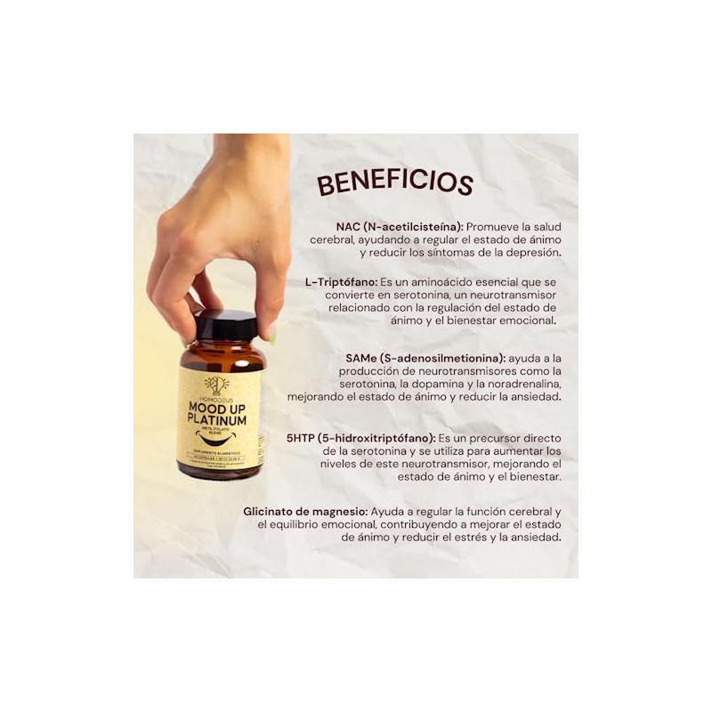 Acerca de este artículo 馃巿銆怭ROMUEVE LA FELICIDAD NATURAL銆慚ood Up Platinum trabaja para incrementar la producción de serotonina, conocida como la "hormona de la felicidad". Con la ayuda de ingredientes como el L-Triptófano y el 5-HTP, este suplemento puede ayudarte a sentirte más feliz, más enérgico y listo para enfrentar cualquier desafío. 馃銆怱OPORTE COGNITIVO銆慐l NAC y la L-Teanina en nuestra fórmula son conocidos por sus beneficios cognitivos. Estos ingredientes ayudan a mejorar la concentración y claridad mental, lo que a su vez puede mejorar tu rendimiento en las tareas diarias. 馃挙銆怭ROMUEVE EL SUEÑO REPARADOR銆慙a L-Teanina y el Glicinato de Magnesio en Mood Up Platinum promueven un sueño reparador y un despertar fresco y lleno de energía. Un sueño de calidad es crucial para un buen estado de ánimo y bienestar general.
