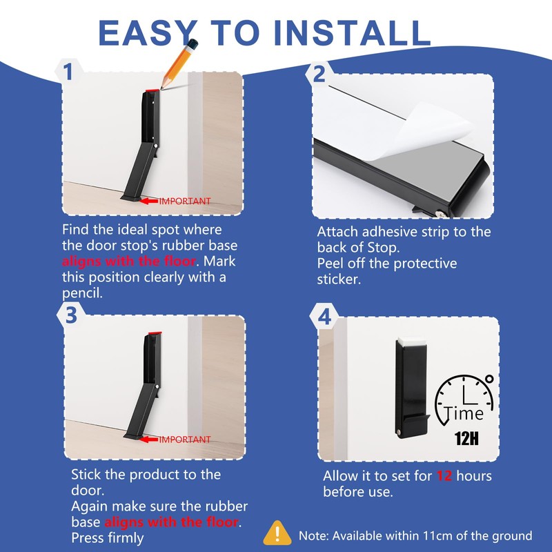 - Warm Tips: The door stop can be used within 11cm of the ground. If you use self-adhesive to install, we recommend letting it sit for 24 hours before using it for more solidity