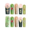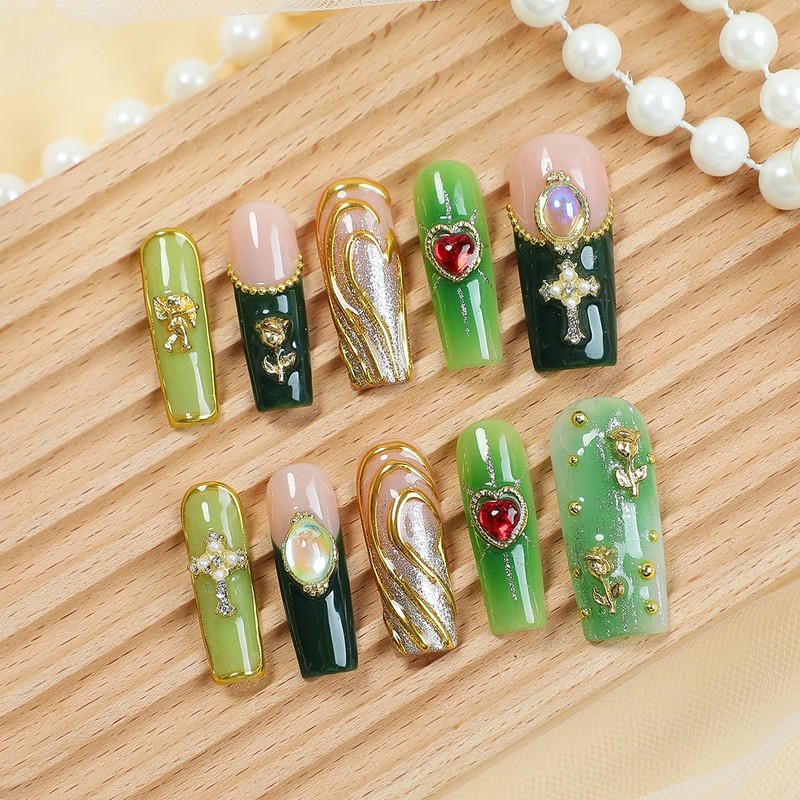 HOMSERA Handmade Press on Nails Long Square, XL French Tip Green and Gold Glitter Fake Nails with 3D Flower Heart and Cross Design, 10 PCS Reusable Full Cover Sparkling Fake Nails for Women (Small)