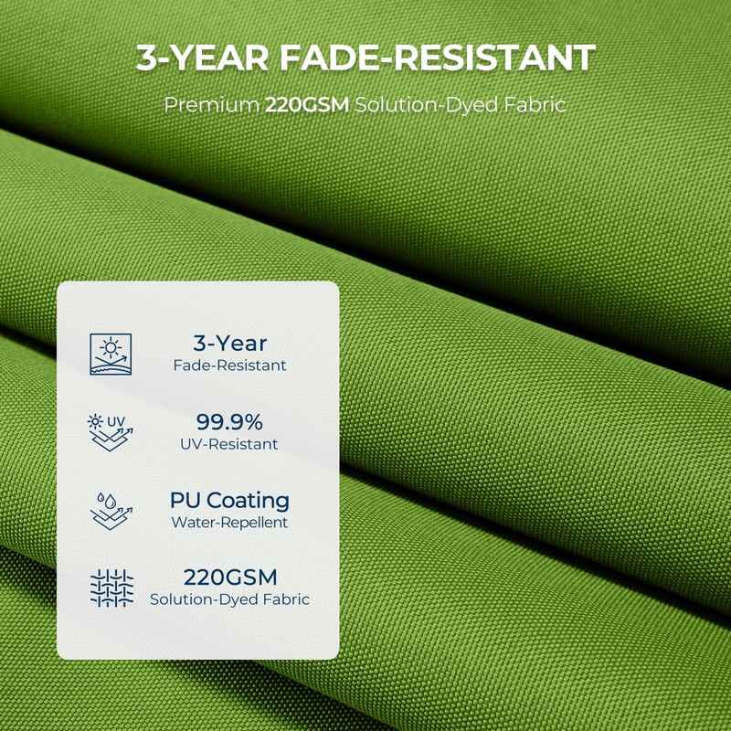 - PREMIUM CANOPY: High-quality 9ft 220gsm solution-dyed fabric with UPF50+ anti-UV coating provides 3-year fade-resistant, 99.9% UV-resistant, and water-repellant properties. Effectively blocks harmful UV rays including UVA and UVB to protect your health.