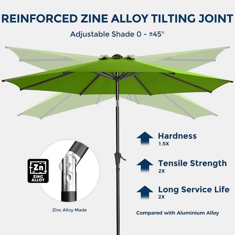- EASY CRANK/TILT ADJUSTMENT: Smooth crank system ensures that opening (clockwise) and closing (counterclockwise) the patio umbrella can be easily accomplished in seconds. Reinforced zinc alloy tilting mechanism has 1.5X the hardness and 2X the tensile strength than the aluminum alloy material, and the service life can be doubled.