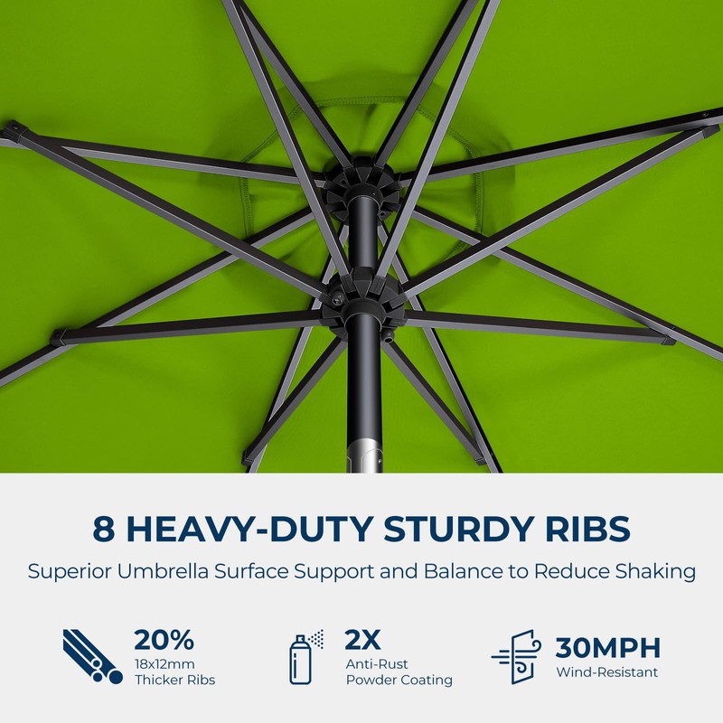 - HIGH-QUALITY FRAME: Durable 8-rib steel alloy frame with a 1.5-inch pole fits all outdoor table apertures. 8 heavy-duty sturdy ribs are 20% thicker(12x18mm), providing superior umbrella surface support and balance to reduce shaking. Can withstand 30 MPH Wind-Resistant. Double powder-coated steel alloy surface brings excellent rust resistance.
