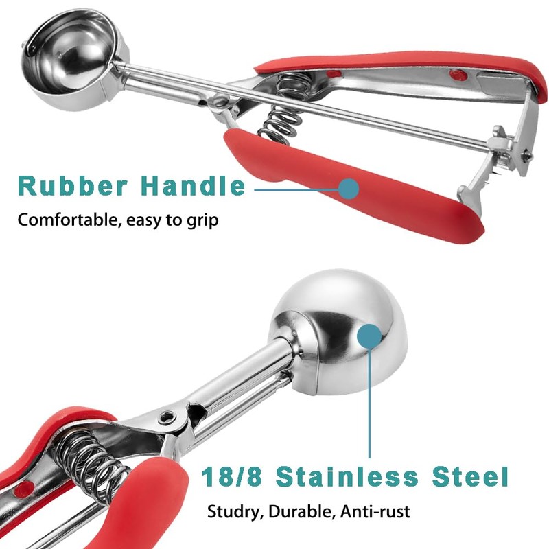 - HIGH QUALITY AND SAFETY - The cookie scoops for baking are made of 18/8 stainless steel, sturdy and durable. With thick rubber handle, non-slip, easy to grasp. Food grade stainless steel can ensure safety and reliability, and these dishers scoops are not easy to rust, corrosion or broken.