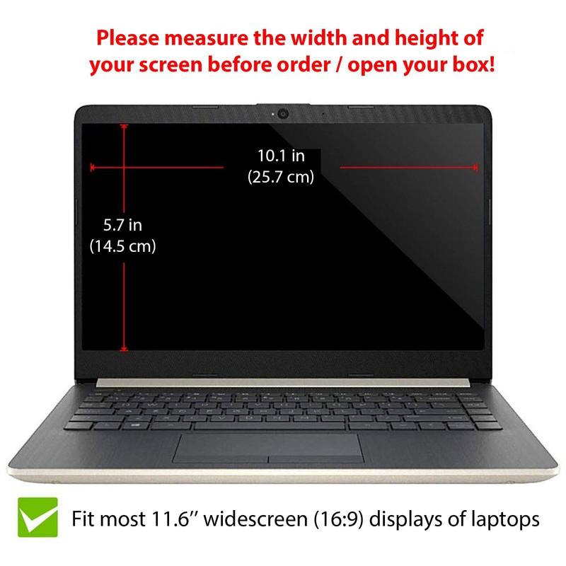 • 💻 DIAGONALLY MEASURED FITS FOR 11.6 INCH portable widescreen laptop 16:9 - measured viewable display area, corner to corner except the frame, filter size (W x H): 10.1 inches (25.7cm) x 5.7 inches (14.5cm)
