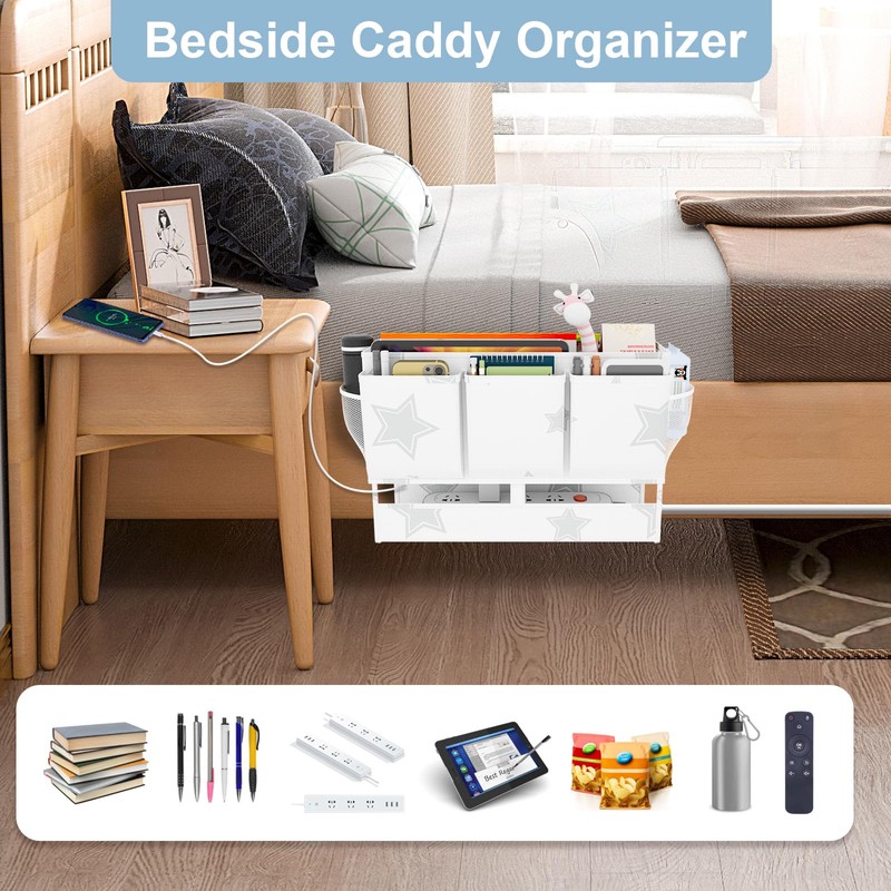 - Bed Organizer with Power Strip Compartment: This versatile hanging caddy offers 3 flexible setup options: Securely attach to bed frames using reinforced hooks, fasten with adjustable straps, or slide the rigid backing board under mattresses. The bottom is designed with power strip storage space, which can better accommodate the use of power strips and meet charging needs. Perfect for dorm rooms or hospital beds where outlets are scarce, it transforms any bedside into a charging station while storing phones or tablets.