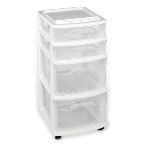 Homz Clear Plastic 4 Drawer Medium Home Organization Storage Container Tower w/2 Large and 2 Small Drawers, and Removeable Caster Wheels, White Frame