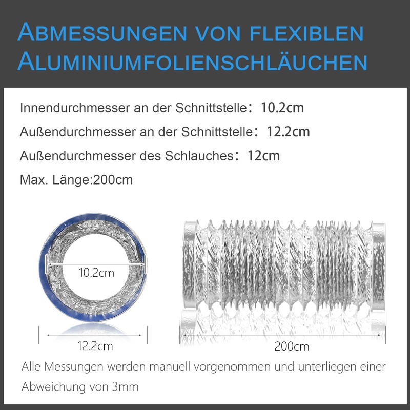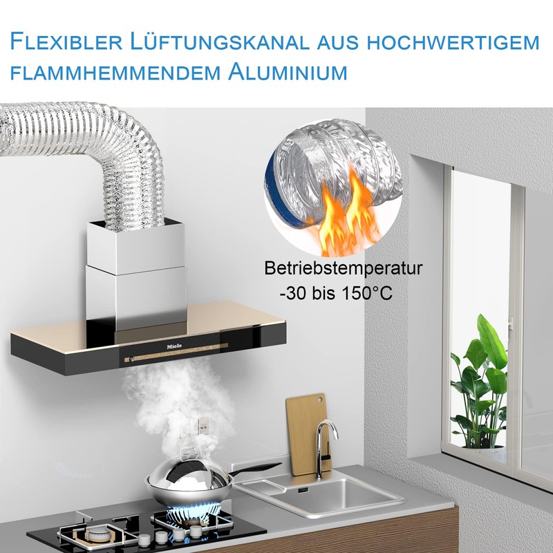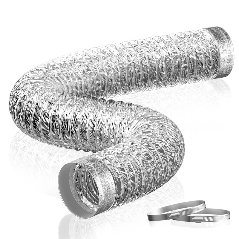 - Exhaust hose with aluminium insulation: this ventilation duct with a diameter of approx. 100 mm comes in a 2 m long piece. Includes two stainless steel channel clamps.