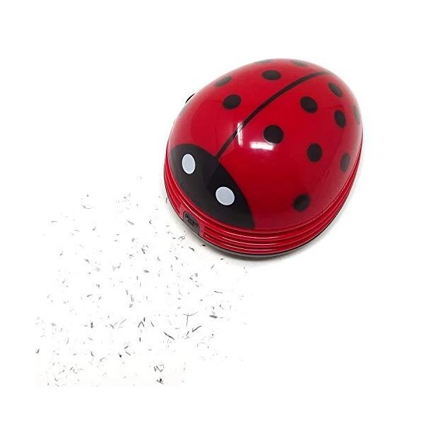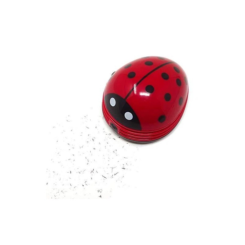 This ladybug dust vacuum is good help to catch the crumbs and eraser shavings after meals or homework,kids are pleased to clean up table after meals and homeworkThis kind of table cleaner is no louder than a hairdryer and has decent suction;sucks up crumbs and dust without any problemPortable Mini Cute Beetle Vacuum Cleaner is widely used in coffee grounds,office desk,bathroom,keyboard top,counterSpecification:1. Weight: about 158g.2. Material: ABS.3. Product size: 105*85*70mm.4. Voltage: DC 3.0V.5. Power: 2 x AA batteries requirement(not included.6. Color: Red + black .Package include1* Ladybug Desk Vacuum Cleaner