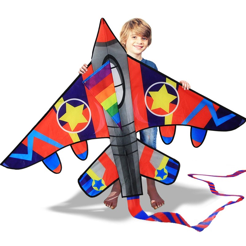- Single-line Fighter Plane Kite Size 58" (147cm) Wide x 42" (107cm) Long with tails, ripstop polyester fabric and durable polyester rods. Kids friendly handle with 200 ft (60m) line and swvel, which makes kite easy to connect.