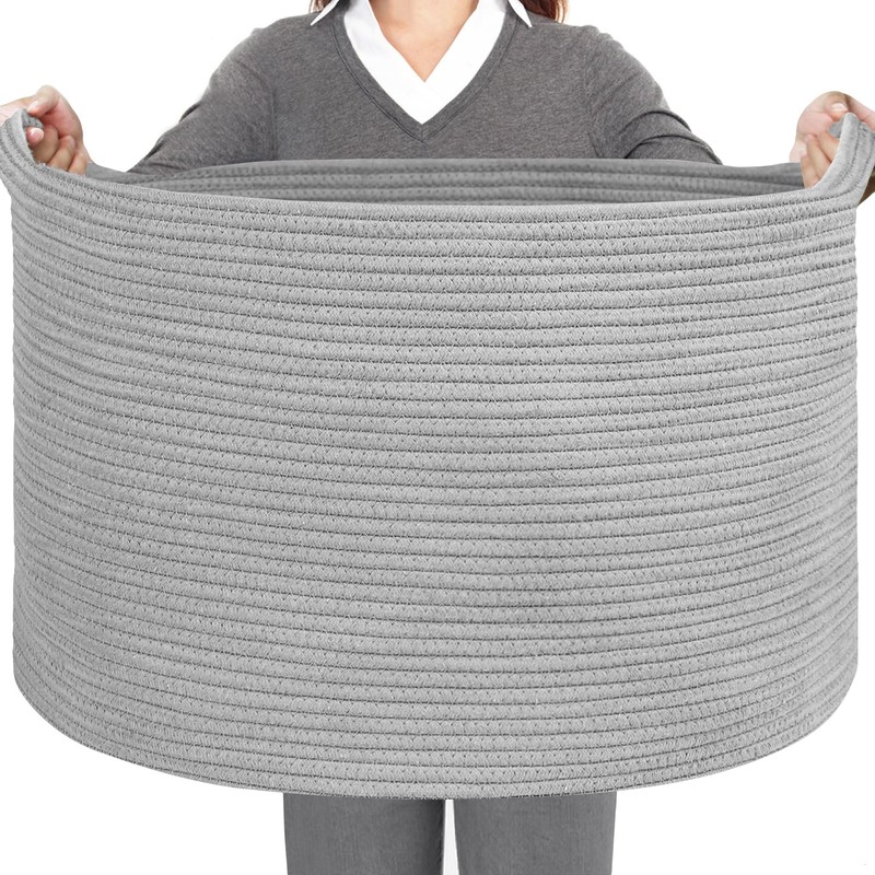 HONCESTA Extra Large Gray Basket - 23.6" x 23.6" x 14.1" Blanket Storage for Living Room, Kids Toy Basket Box, Rope Baskets for Storage, Oversized Laundry Basket, Large Woven Baskets for Organizing