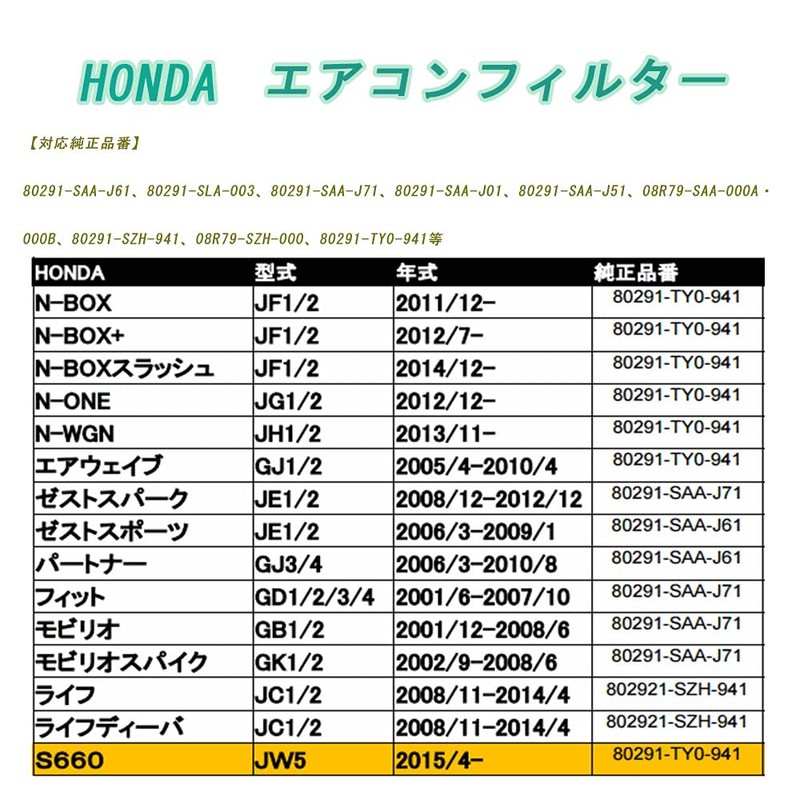 - [Compatible models]: Honda (HONDA), N-BOX; Model: JF1/JF2; Year: 2011/12-; N-BOX+; Model: JF1/JF2 / Year: [2012/7-]; N-BOX Slash / Model: JF1/JF2 / Year: [2014/12-] ONE / Model: JG1/JG2 / Year: [2012/12-] N-WGN / Model: JH1/JH2 / Year: [2013/11-] Airwave / Model: GJ1/GJ2 / Year: [2005/4-2010/4] / S660 / Model: JW5 / Year: [2015/4-]