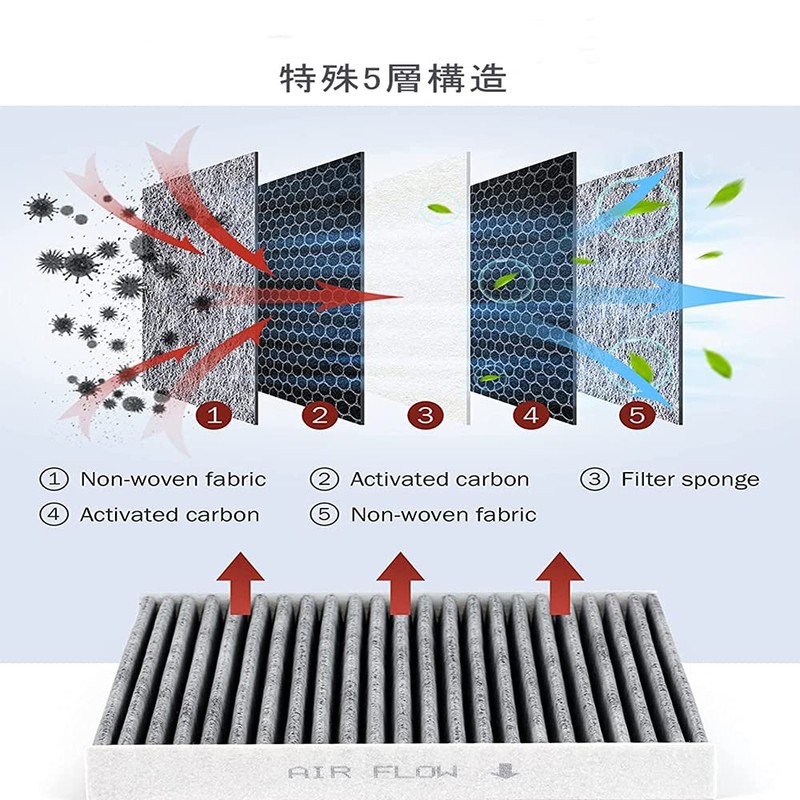 - 5-Layer Filter: The 5-layer filter material is used to filter pollen, dust, and other particles from outside the vehicle. Inhibits the growth of viruses, bacteria, and mold, and provides gentle air for babies and elderly people with weak immunity
