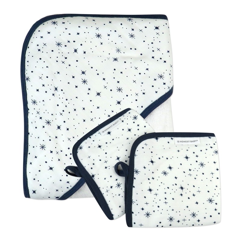 HonestBaby Unisex Baby 3-Piece Organic Cotton Hooded Towel & Washcloth Set, Twinkle Star White/Navy, One Size