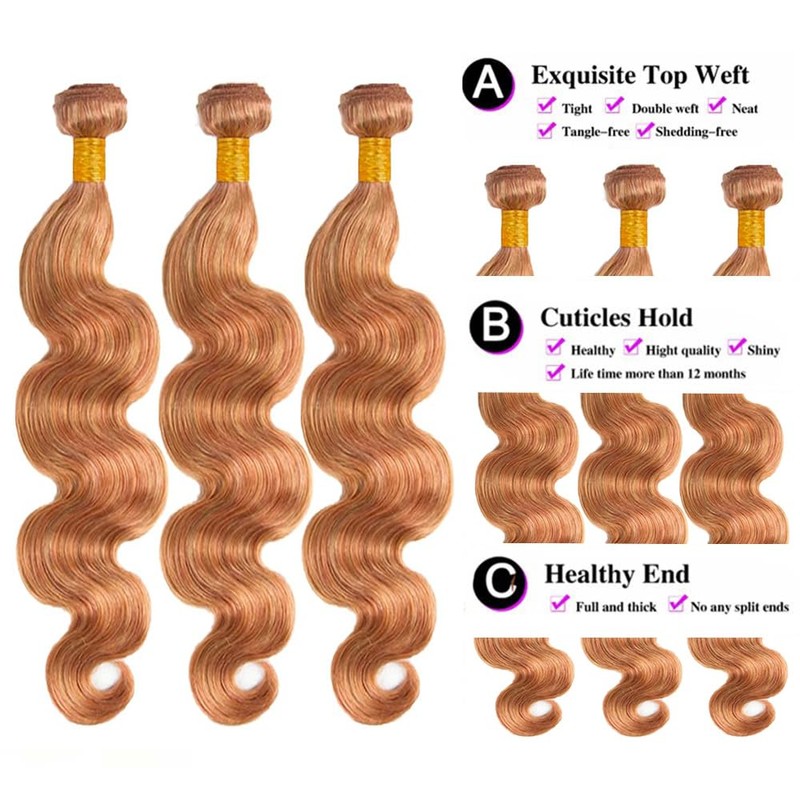 Honey Blonde Bundles P27/30 Body Wave Human Hair Highlight Light Brown Bundles Human Hair Healthy and Soft Remy Hair Extensions 18 20 22 inch