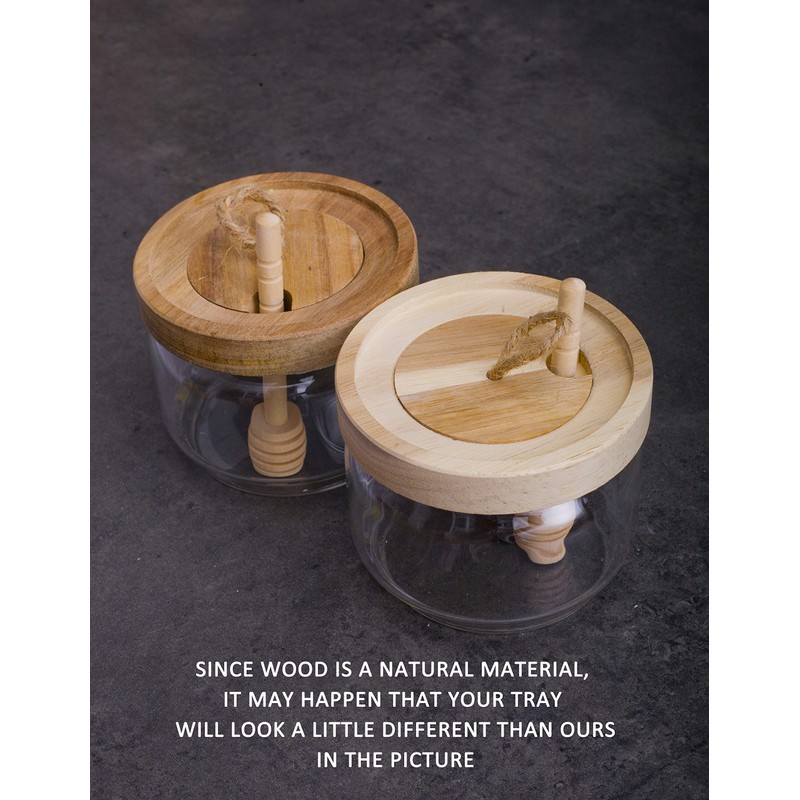 Made of 100% safe premium quality glass with acacia lid cover and wooden dipper.