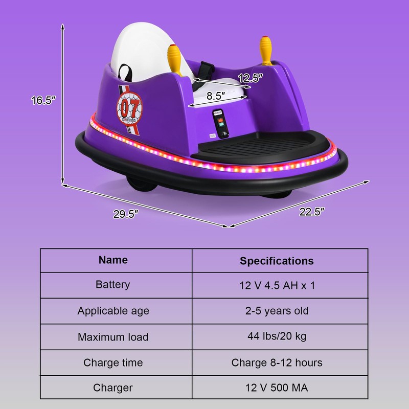 - 【Upgraded 12V Battery Performance】: Powered by 12V 4.5A rechargeable battery and two motors, this kids bumper car can travel for hours after the 8-12 hours charging time. Anti-flat tires can be used on most indoor and outdoor surfaces, including wood, tiles, concrete floors and so on.