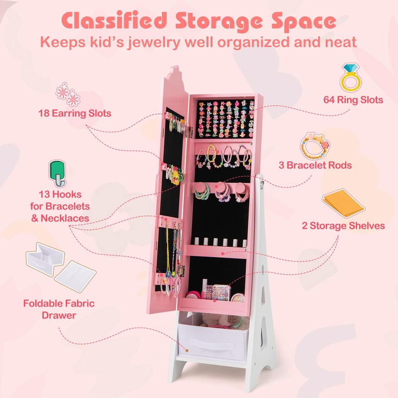 Featuring an HD silver mirror for a head-to-toe view, this jewelry cabinet ensures your kids always look stylish. The jewelry organizer offers ample storage with various compartments for earrings, bracelets, rings, and more. This 2-in-1 space-saving solution combines a mirror and jewelry storage, making it perfect for compact spaces. Built to be sturdy and safe, it complies with ASTM and CPSIA standards, with the option to secure it to the wall for added safety.