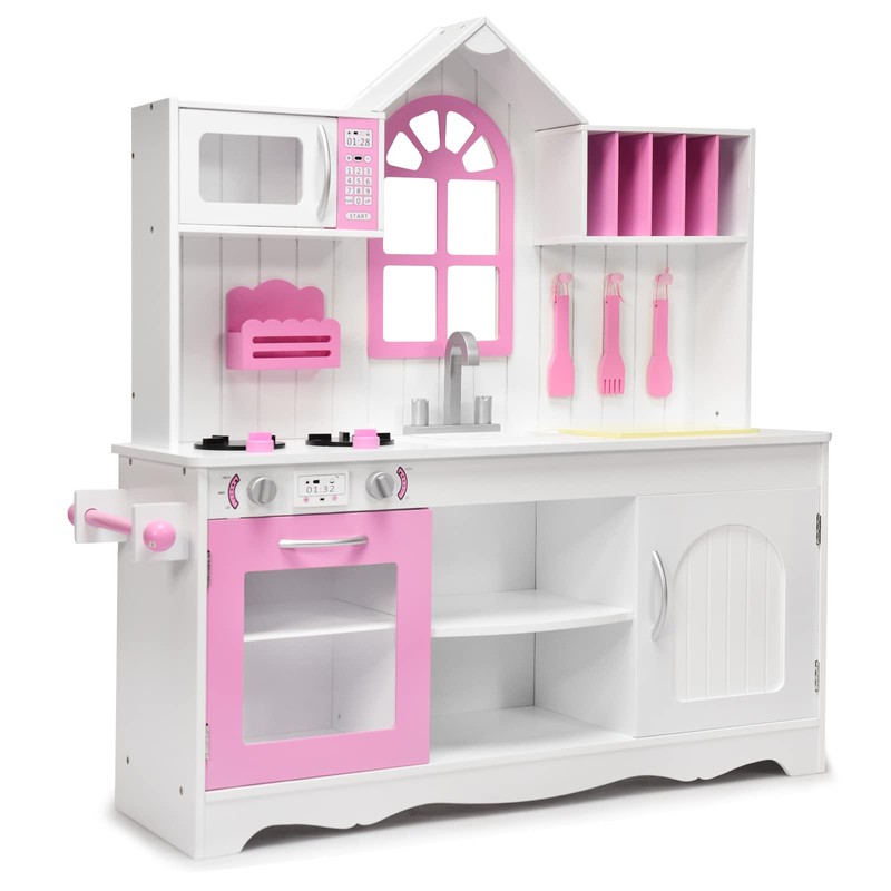 HONEY JOY Pink Kids Kitchen Playset, 43 Inch Rooftop Wooden Play Kitchen for ...