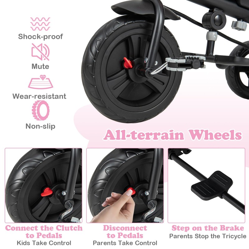 - 【Safety First】The baby tricycle takes safety seriously. Equipped with a 5-point harness and detachable guardrail, your infant will feel secure throughout their adventures. Take charge of the tricycle stroller’s direction with the front wheel clutches disconnected to the pedals and enjoy peace of mind with the rear step brake while on the go.