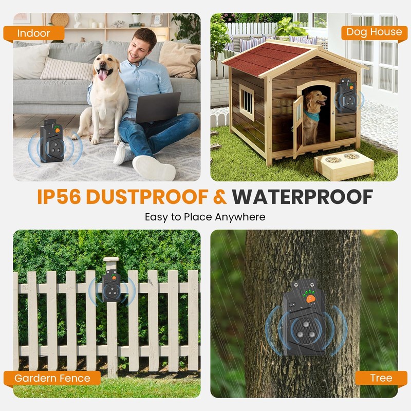 - Weatherproof & Portable – Use It Anywhere You Need: IP56-rated waterproof casing and a retractable hanging hole make this anti bark unit ideal for all weather and settings. Hang it on trees, place it indoors, or take it on the go – it’s the most versatile anti barking device for dogs in 2025.