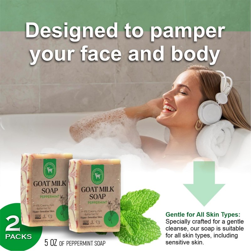 This 2-pack includes two 5 oz bars, offering long-lasting hydration and a luxurious cleanse. Whether you're at home or on-the-go, this eco-friendly soap will keep your skin feeling rejuvenated and refreshed. Enjoy the cooling sensation of peppermint and the nourishing properties of goat milk with every wash.