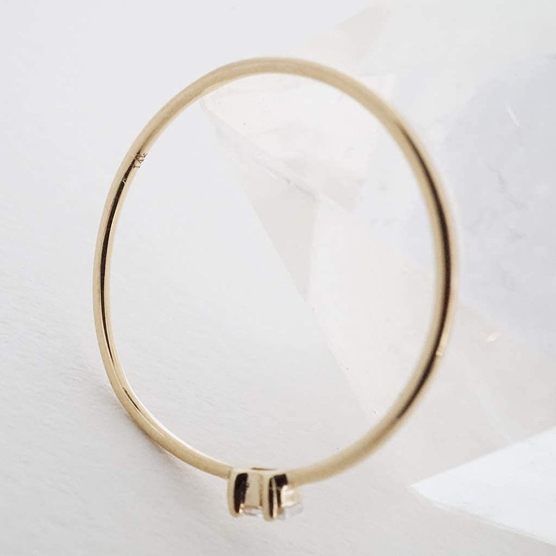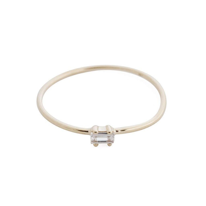 - DESIGN DETAILS: A skinny ring in solid 14k gold or 14k rose gold topped with a tiny, white topaz baguette. This simple ring is equally gorgeous when worn alone as it is when stacked alongside your favorite rings. Band measures .8 mm wide. Baguette measures in at a tiny 3 mm x 1.7 mm. White topaz is believed to provide protective qualities to calm the mind and heal the soul. This delicate piece can be worn on your ring finger, thumb, pointer - wherever!