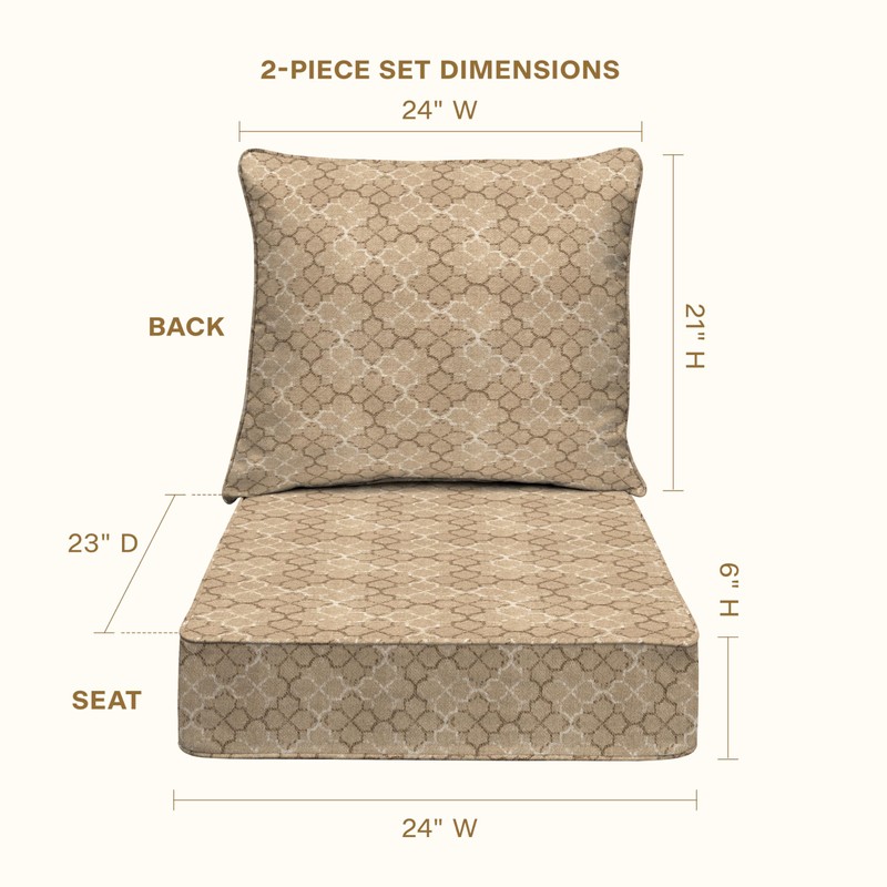 Revive your outdoor living space in comfort and style with the patio deep seating cushion from Honeycomb. The seat cushion measures 24" wide x 23" deep x 6.5" thickness and the back cushion measures 27" wide x 23" tall. This deep seating cushion is designed to fit most standard outdoor deep seating chairs. Crafted with durable outdoor fabric and supportive foam filling, this cushion will resist the elements while remaining bright and beautiful for years to come.
