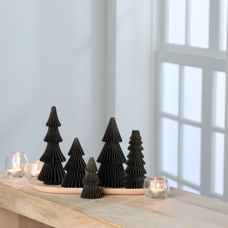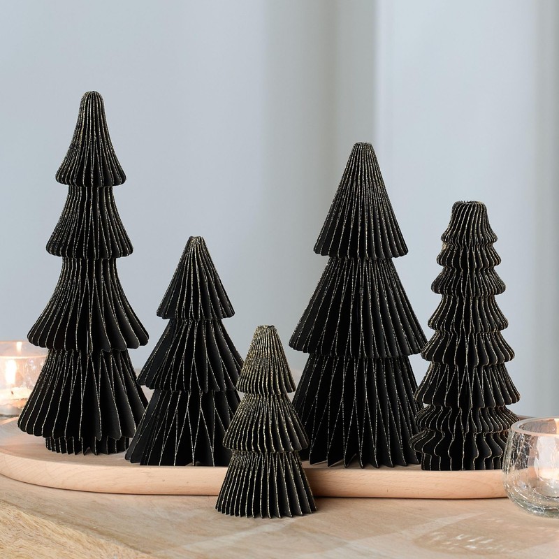 Honeycomb paper Black Set of 5 trees, minimalist Christmas tabletop trees, gold glitter edging, festive charm, holiday season mantel, winter (Small Set 5 Black)