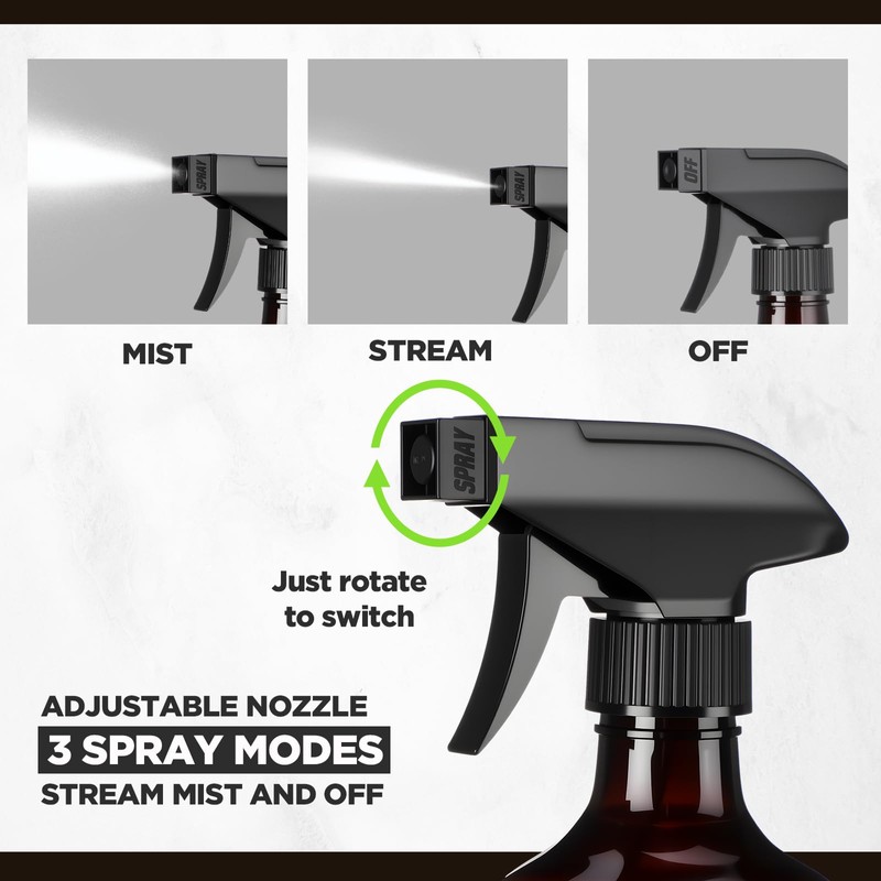 - Adjustable Nozzle: The bottles feature an adjustable spray nozzle with three distinct modes: full mist, directional spray, and closed. With a simple twist, tailor the spray to perfectly suit your needs, conserving time and effort by reducing the need for frequent refills