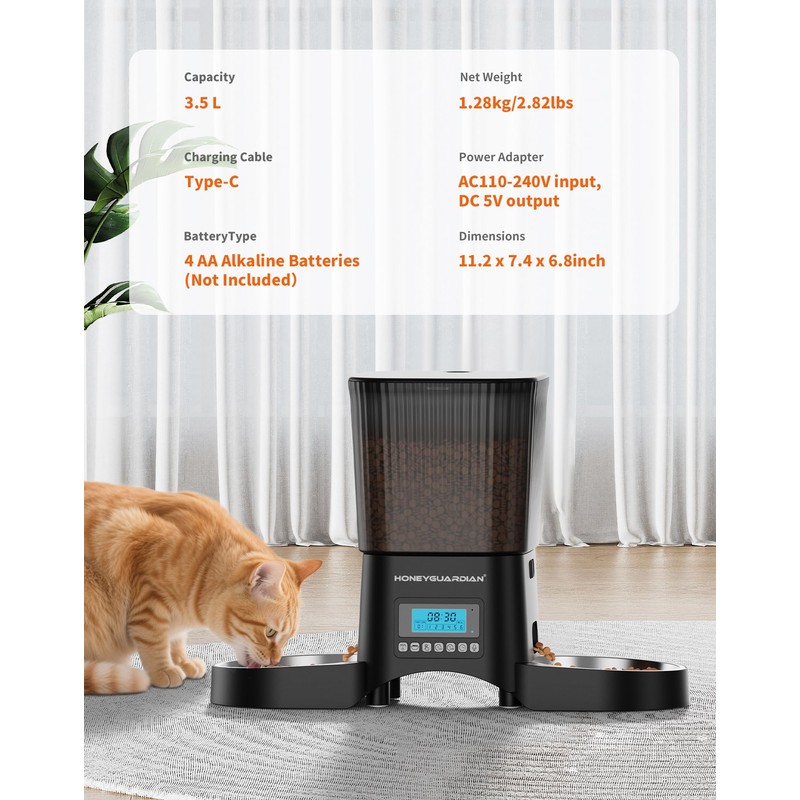 - [Dual Power Supply ] The timed cats feeder can be powered by USB power adapter and 4 AA-size batteries (NOT Included). In the event of a power outage, the automatic feeder will automatically switch to battery-powered. For battery use only, 200-day long battery life allows the feeder placed anywhere in the house,