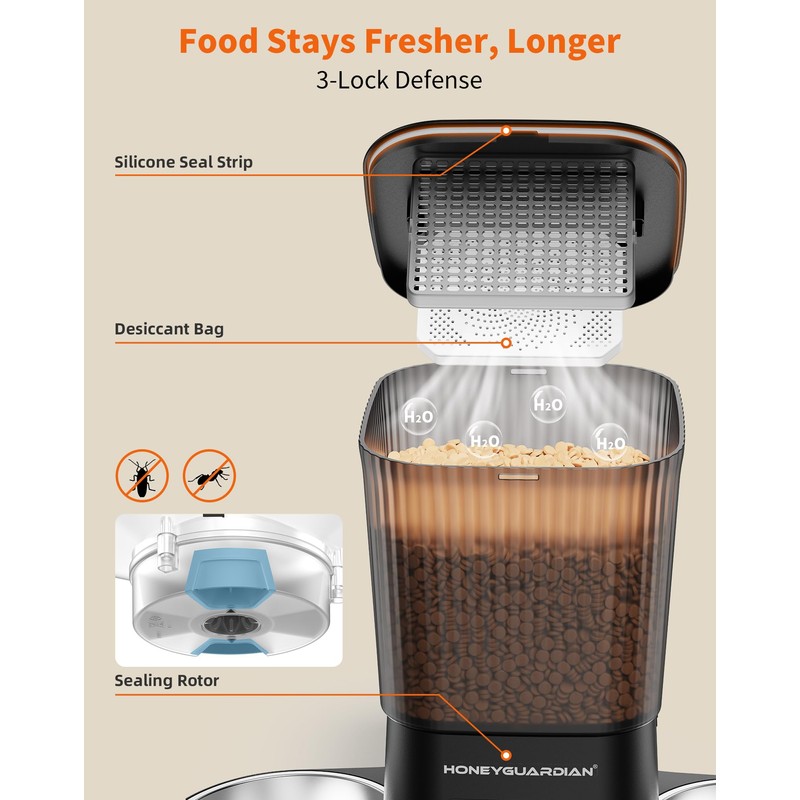 - [3-Stage Seal Keeps Food Fresh] ①The rubber seal between the lid and the container of the automatic feeder effectively insulates the air to prevent the food from oxidizing and prevents the smell of your pet's food from escaping ② There is also a desiccant bag on the lid to dehumidify and prevent moisture ③The unique rotating food convey gear design covers automatically the feeding chute after each feeding, preventing insects from sneaking in.