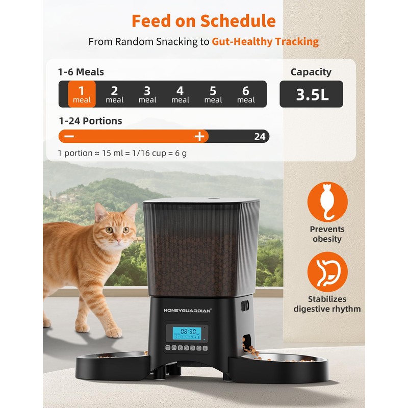 HoneyGuaridan Automatic Cat Feeder for 2 Cats, Automatic Cat Food Dispenser, Timed Pet Feeder for Cats and Dogs, Desiccant Bag, Programmable Portion Control,10s Voice Recorder
