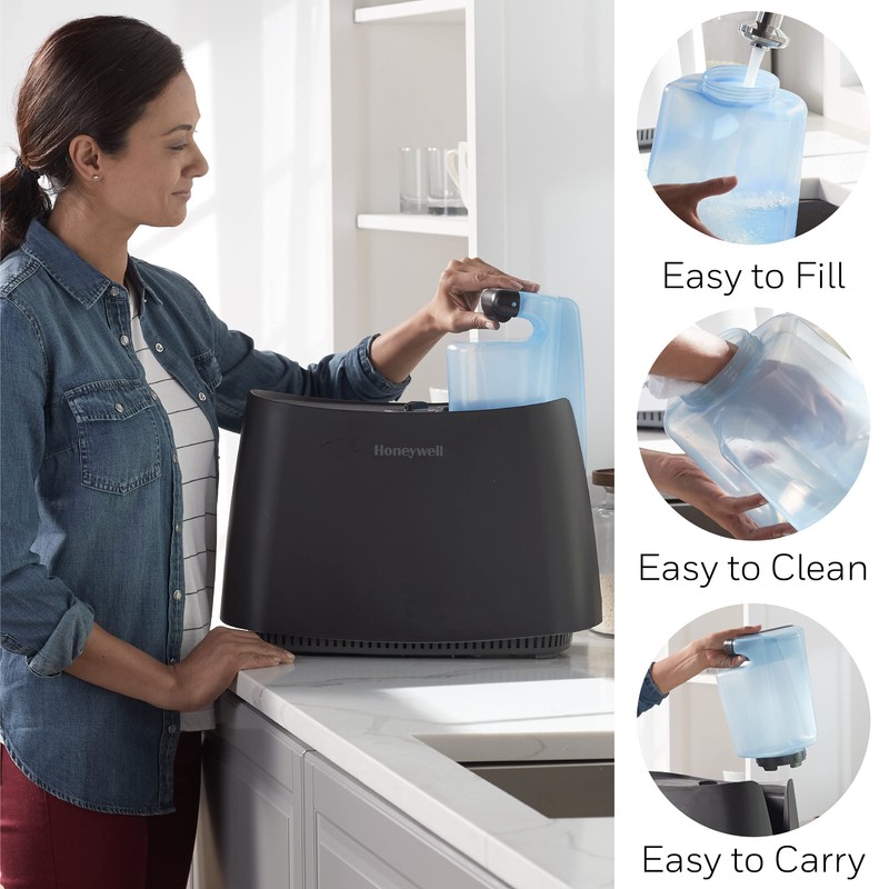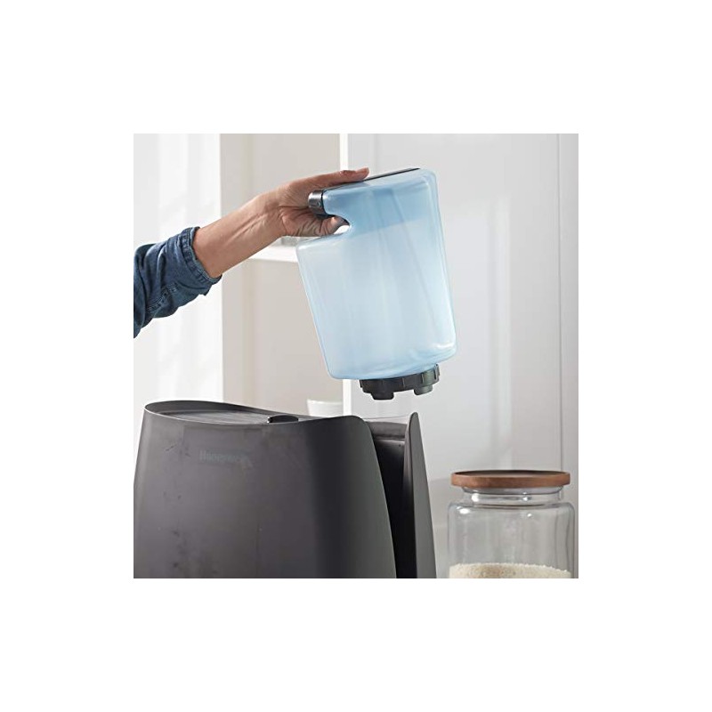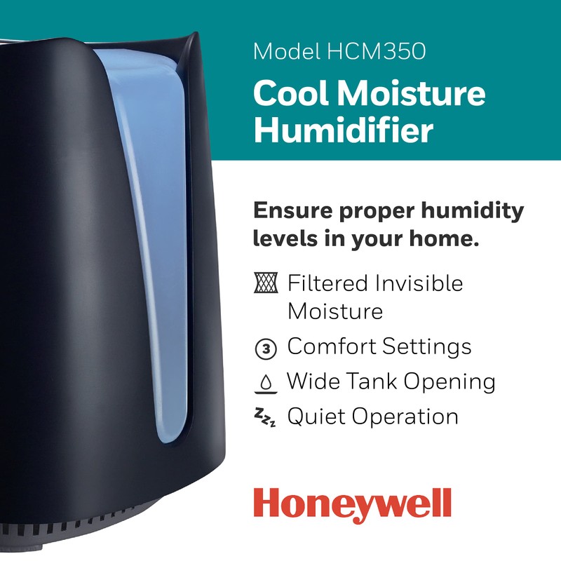 Honeywell Cool Moisture Humidifier is an easy way to bring invisible moisture to your home. Designed to bring you everyday comfort, it will add invisible moisture to the air to soothe a dry throat and dry, itchy skin caused by a heater, air conditioner or dry air climates. It's a cool moisture humidifier with evaporative technology that increases, stops, and holds the targeted humidity level to optimize moisture in the room. UV technology helps treat the water for a cleaner mist, while the wicking filter captures minerals from the water to keep them out of the air.Featuring a large, 1.1 gallon, easy-fill, self-standing tank, this Honeywell humidifier provides up to 24 hours of run time, meaning it can run overnight without needing a refill. It's the perfect humidifier for bedrooms, with a soft, fan-like sound to add restful noise to any room. Plus, It's easy to clean as all parts that touch water are dishwasher safe.For best performance, use only a Genuine Honeywell Replacement Wicking Filter A. Compatible humidifier filter replacements are not guaranteed to offer the same performance or efficiency.