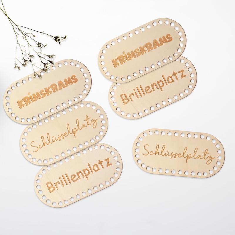 - What you get: This practical set contains 6 high-quality wooden shelves for crochet baskets - two pieces each design, so three different styles in total. On the wooden pieces are printed "glasses place", "knick-knits" and "key place". These lovingly designed labels give the baskets not only structure and function, but also a decorative touch.