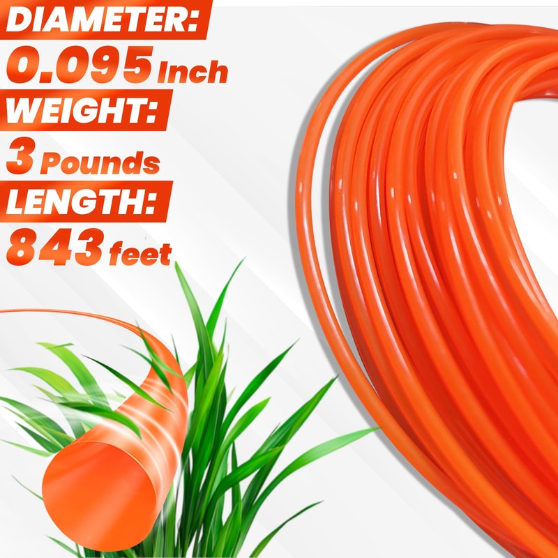 - Orange Trimmer Line: Our trimmer string has a diameter of 0.095 inches and a length of 843 feet. The orange weed eater string’s bright color ensures precise cutting path tracking, reducing accidental turf damage.