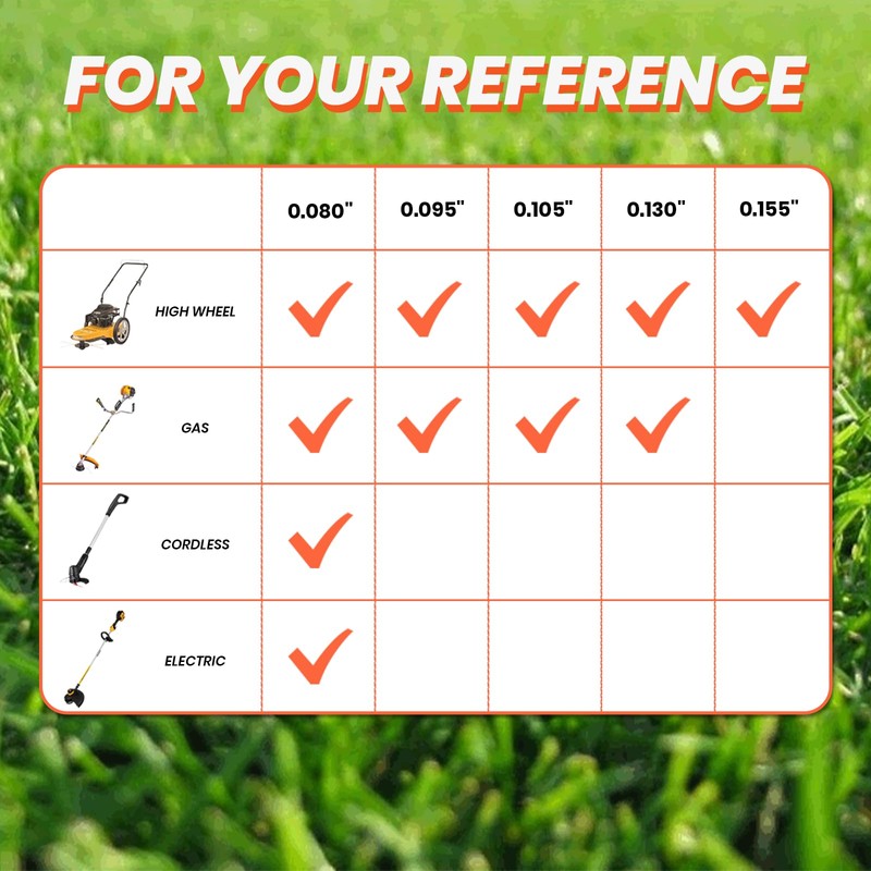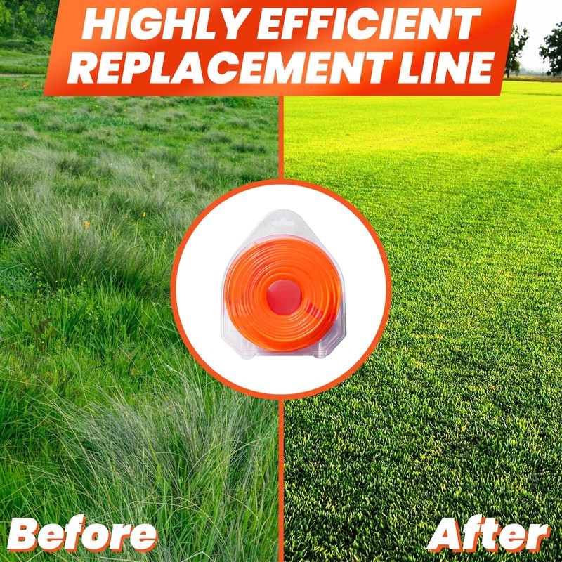- Orange Trimmer Line: Our trimmer string has a diameter of 0.130 inches and a length of 148 feet. The orange weed eater string’s bright color ensures precise cutting path tracking, reducing accidental turf damage.