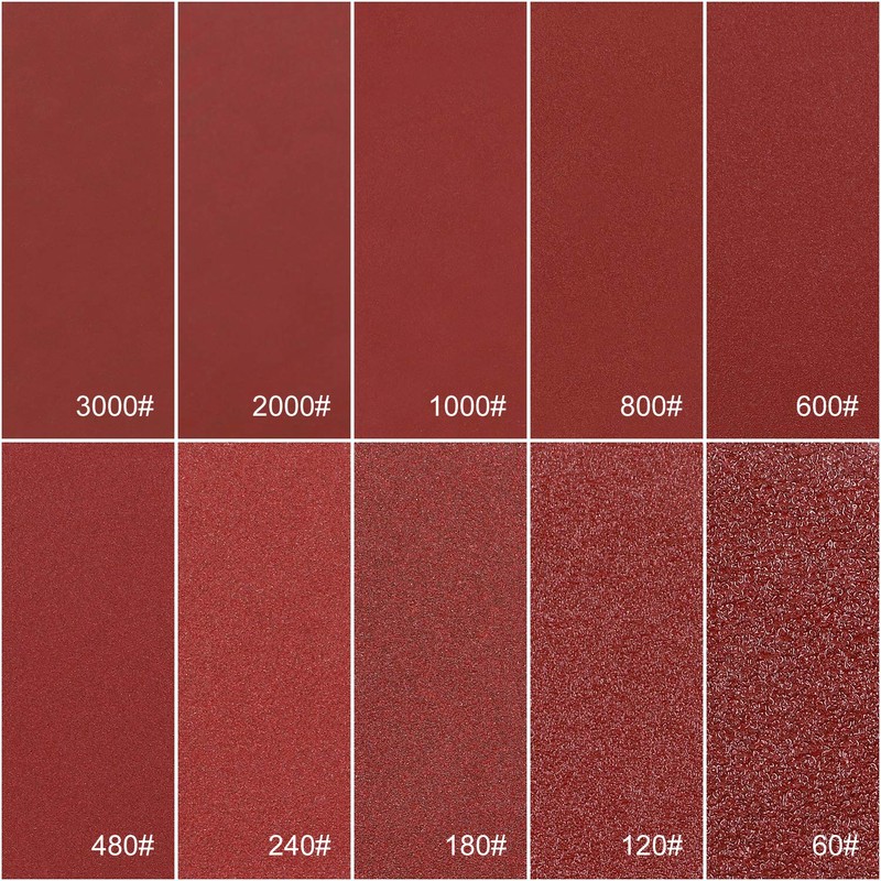 There are 10 different specifications for the 30 sheets of sandpaper: 60Grit; 120Grit; 180Grit; 240Grit; 400Grit; 600Grit; 800Grit; 1000Grit; 1200Grit; 2000Grit; 3000Grit.