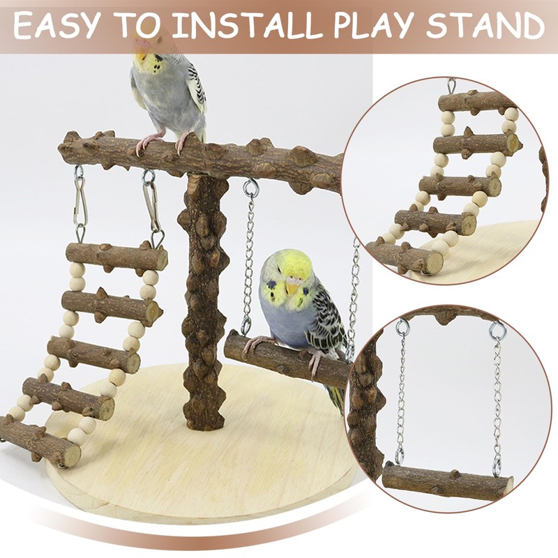 Natural wooden bird play stand provides birds with entertainment, exercise, and mental stimulation to stay healthy and active. Creates a safe, comfortable activity space to enhance interaction and quality of life.