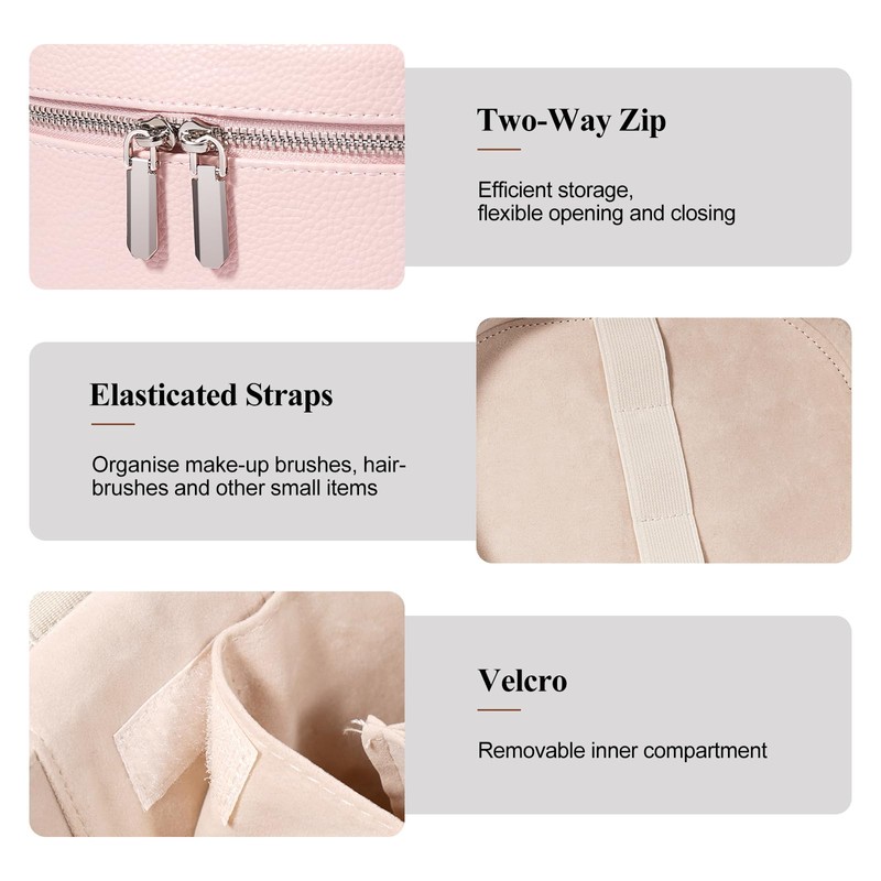- Detailed Design: This Toiletry Bag comes with removable compartments inside, you can use the compartments according to your own placement habits, the elastic band inside the lid can fix makeup brushes, combs, hairpins and other small items, to ensure that all the items can be placed in the right place
