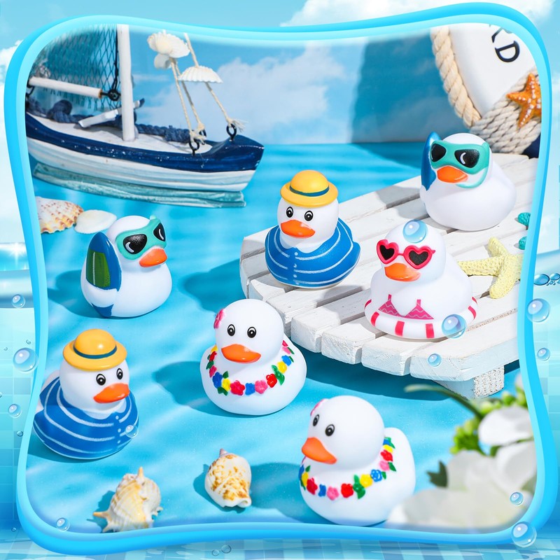 - Exclusive Summer Theme: our summer rubber ducks principally adhere to a summer beach theme; Each duck boasts of a unique style, from garlands to stripe shirts, glasses and bathing suits, thus making them ideal embellishments for summer themed gatherings