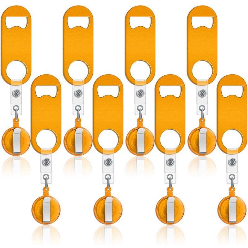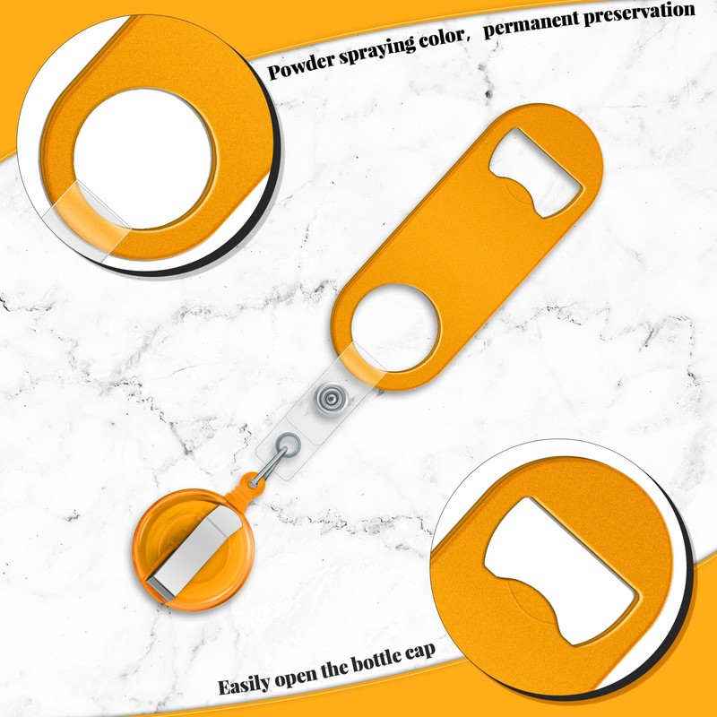 - Amounts of the Package: you will get 8 pieces of beer bottle openers in orange color and 8 pieces of orange round badge reel, enough quantities are sufficient for you to meet your different applying demands or sharing with your friends