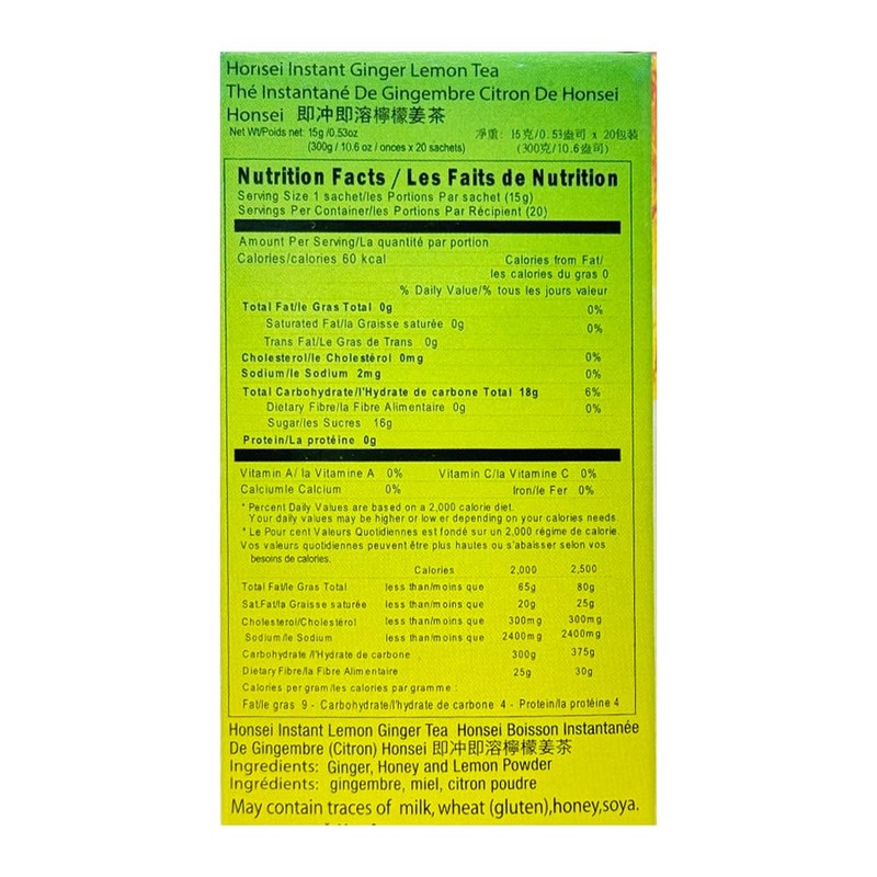 - Honsei Ginger Honey Original Flavor 18 g/0.63 oz., 20 Sachets and Ginger Lemon Tea 15g/0.525oz 20 Sachets Set