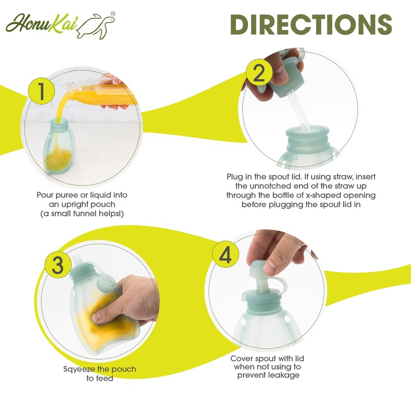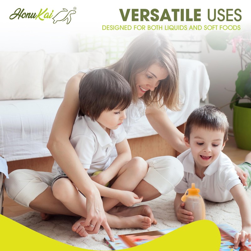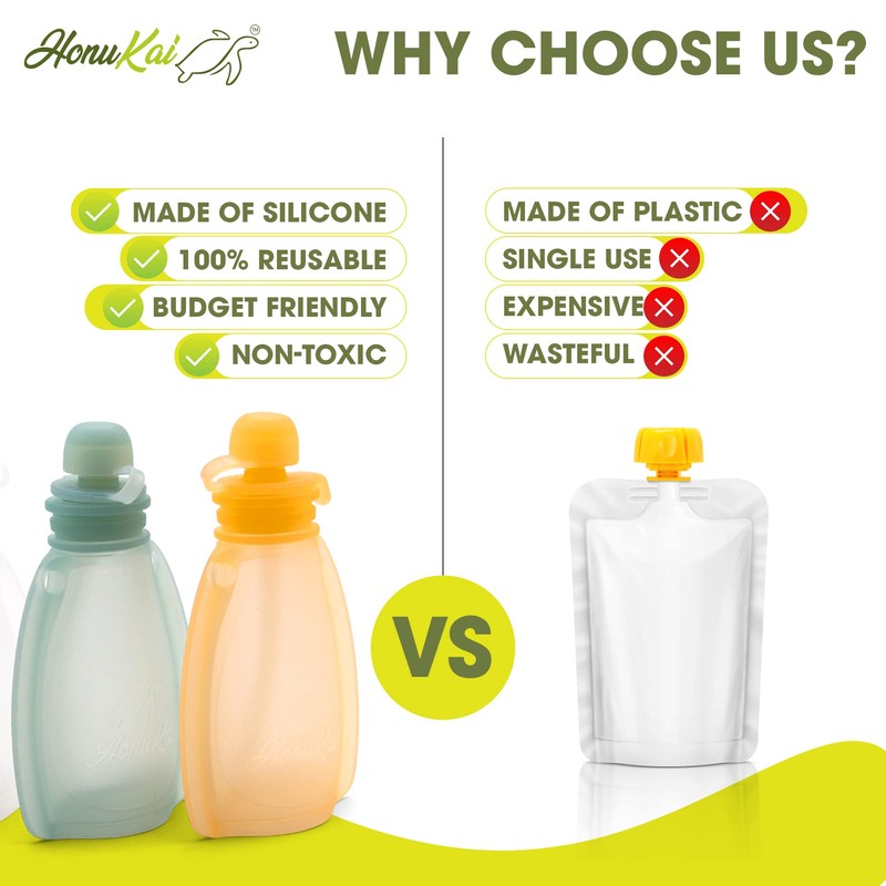 - SAVE MONEY AND ENJOY VERSATILE USES: HonuKai pouches are designed for both liquids and soft foods including purees, yogurt, smoothies, apple sauce, sauces etc. There's no limit to their use cases! Encourage healthy and independent eating habits from a young age by using them for homemade food and save big by not buying store bought single-use puree pouches.
