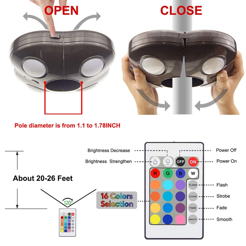 **HONWELL Patio Umbrella Light will provide enough brightness and give you wonderful feeling when you camping in the wild or doing any activity during the night. ** **MORE DETAILS ** * 250 Lumens, 20 super bright LED lighting, 3000K warm white light , 2.8W, DC 4.5V, lifespan is 30,000 Hours. * Powered by 6 AA batteries (not included) and the batteries run time is 50 hours. * The remote control will operate outdoor patio lights within 20-26ft. **Installs Quickly ** (1) Press the Quick Release Button to separate the light. (2) Place the light around the pole and re-connect the light. Be sure it clicks closed securely. **Operation ** -1st press to turn warm white light ON. -2nd press to turn red light ON. -3rd press to turn green light ON. -4th press to turn blue light ON. -Press again to turn the light OFF. If LEDs appear to be dim, this is an indication that your batteries need to be replaced. If cut off the rubber sleeve in the middle of the umbrella light hole , the diameter of the single side is 49mm and the diameter of both sides is 53mm. **Notice ** \--Umbrella & Batteries are NOT included. \--Please pay attention to waterproof, If it raining, storming, hail, it is best to take it off. **Packing List ** \- 1 x 20 LED Patio Umbrella Light \- 1 x Remote Control \- 1 x User Manual ************************