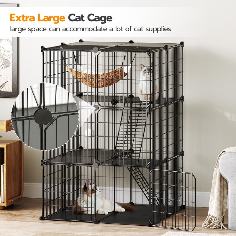 • Large Cat Cage: Sized at 29 x 29 x 42 inches, the indoor cat enclosure creates a spacious playground for your energetic furry friend of all stages. The 3-tier cat cage houses allows you to divide the cage into litter box, feeding, resting and playing areas separately