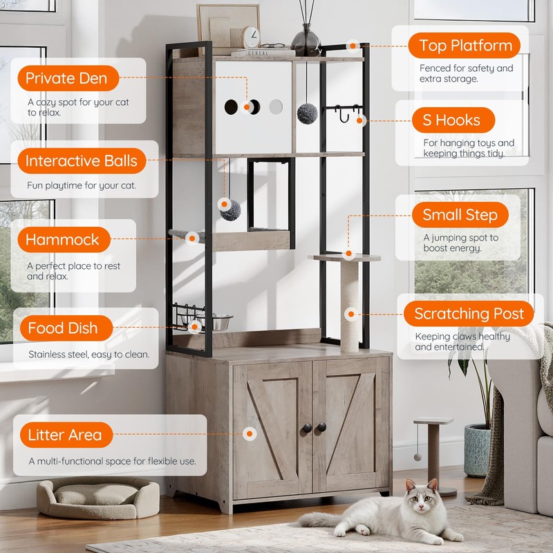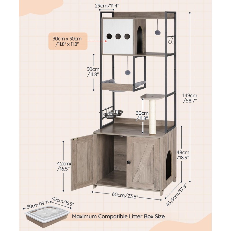 - Multi-Functional Cat Litter Box Enclosure: The cat litter box enclosure includes a large double-door cabinet measuring 23.6"L x 17.9"W x 18.9"H perfect for storing a litter box or cat supplies. The overall dimensions of the cat tower with litter box enclosure are 23.6"L x 17.9"W x 58.7"H. This space-saving design keeps your home organized and neat
