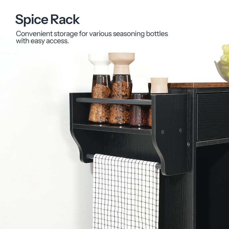 - Superior Storage Capacity: This kitchen island boasts a spacious top and 2 shelves for cooking tools, dishes, and kitchen essentials. The spice rack of kitchen island provides easy storage for condiments and a hanging cloth, enhancing the ease of cooking and cleaning